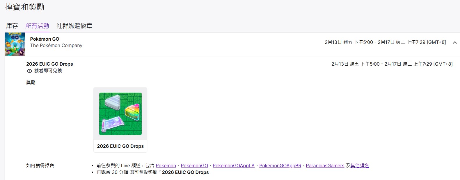 Twitch 直播與掉寶庫存頁面: https://www.twitch.tv/pokemongo