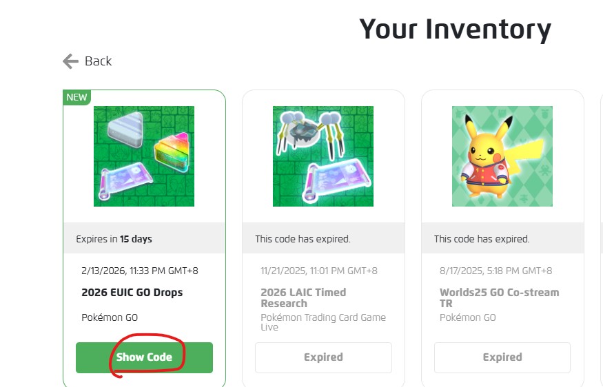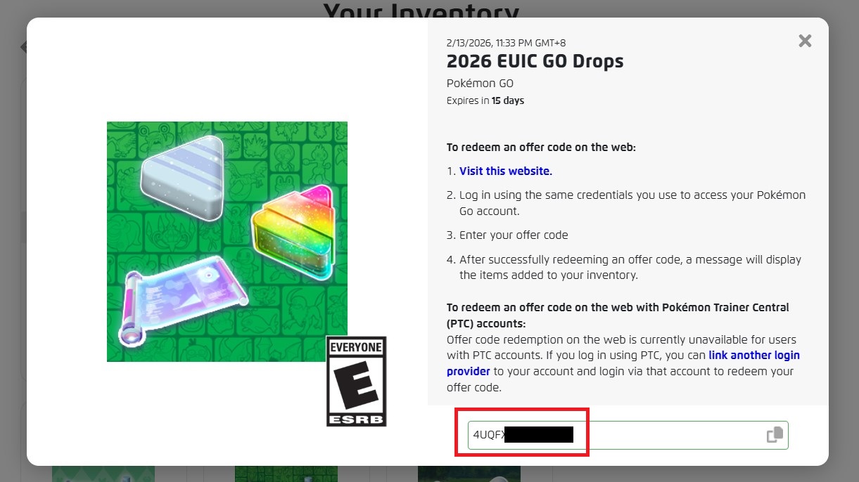連結帳戶與顯示代碼: 造訪 Pokémon 獎勵頁面,連接您的 Pokémon Trainer Club 帳戶和 Twitch 帳戶,找到該 drop 並選擇顯示代碼。