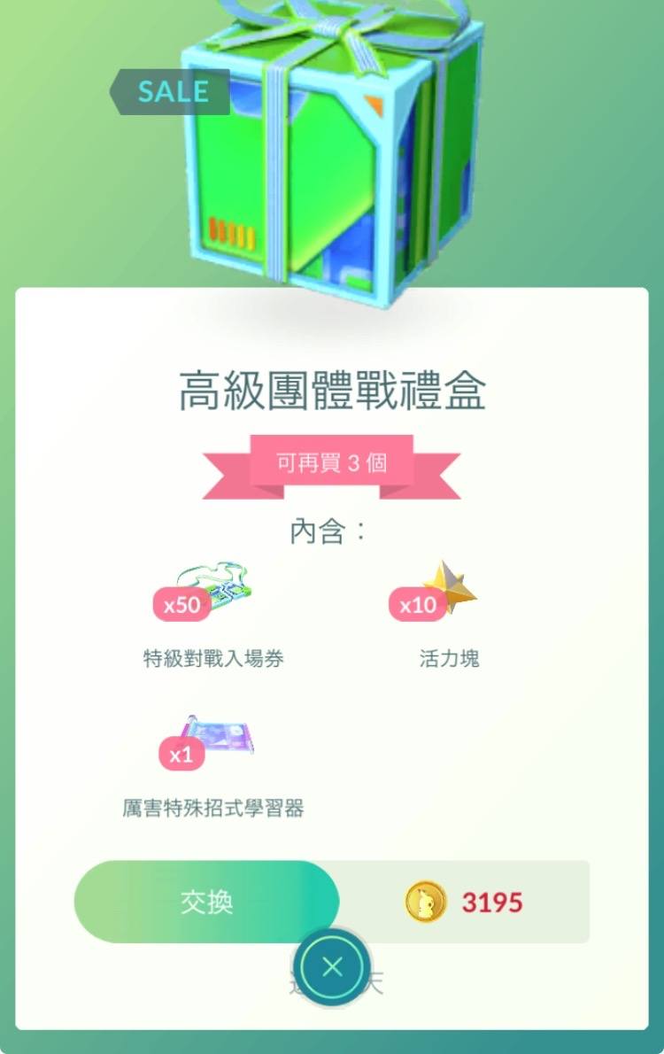圖中這包 3195 幣的禮盒多了一張厲害特殊招式學習器(俗稱黑大招券)。