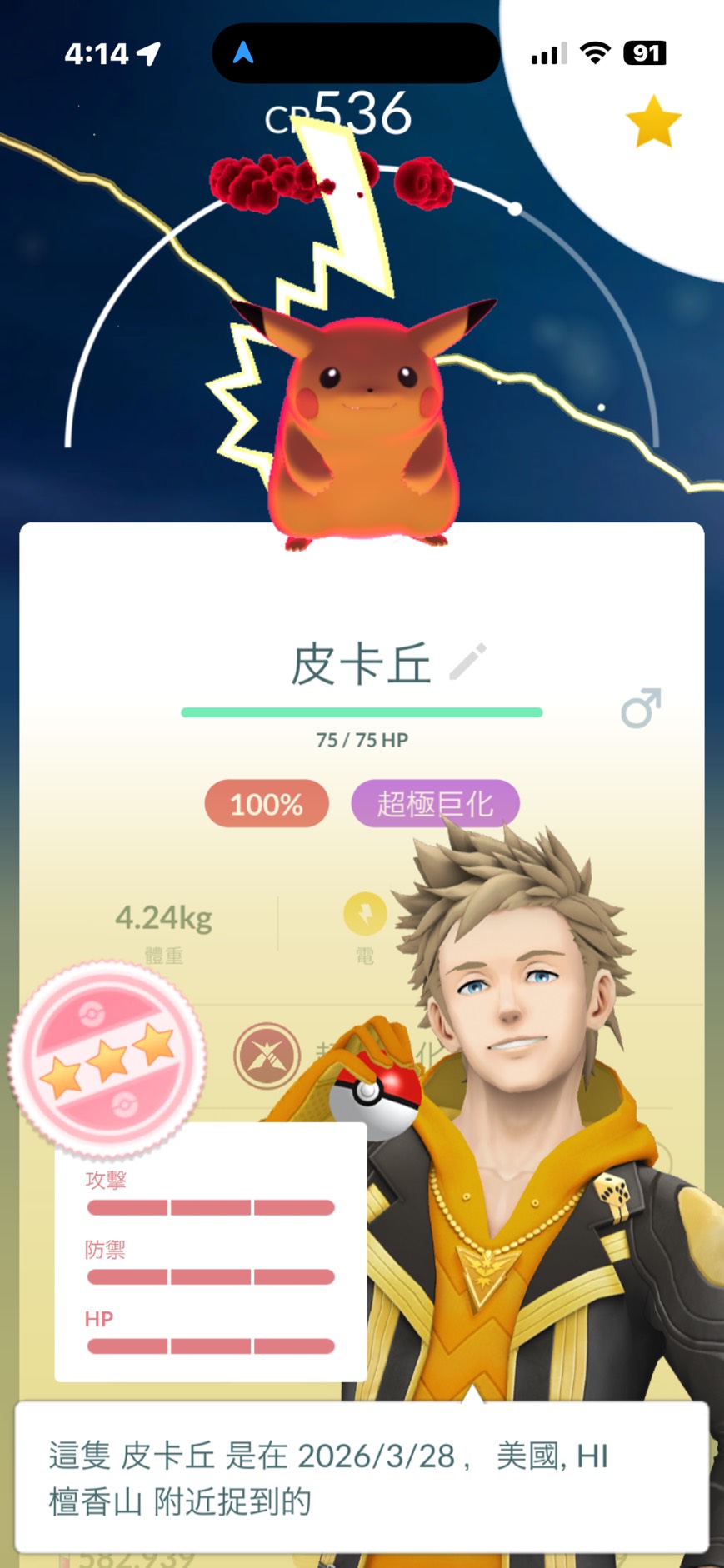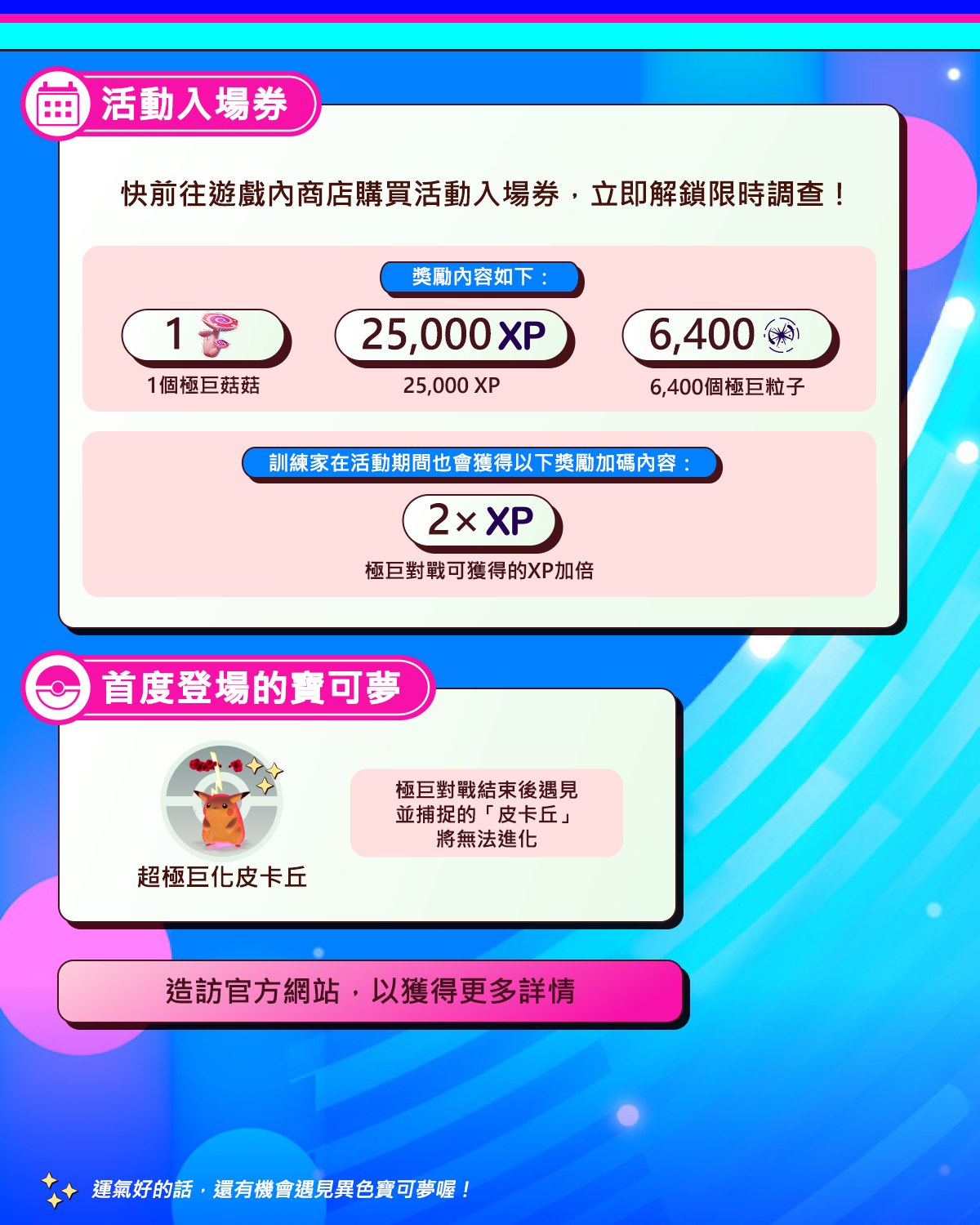 色違機率提升:超極巨化皮卡丘的色違個體極其稀有,建議把握這 3 小時。