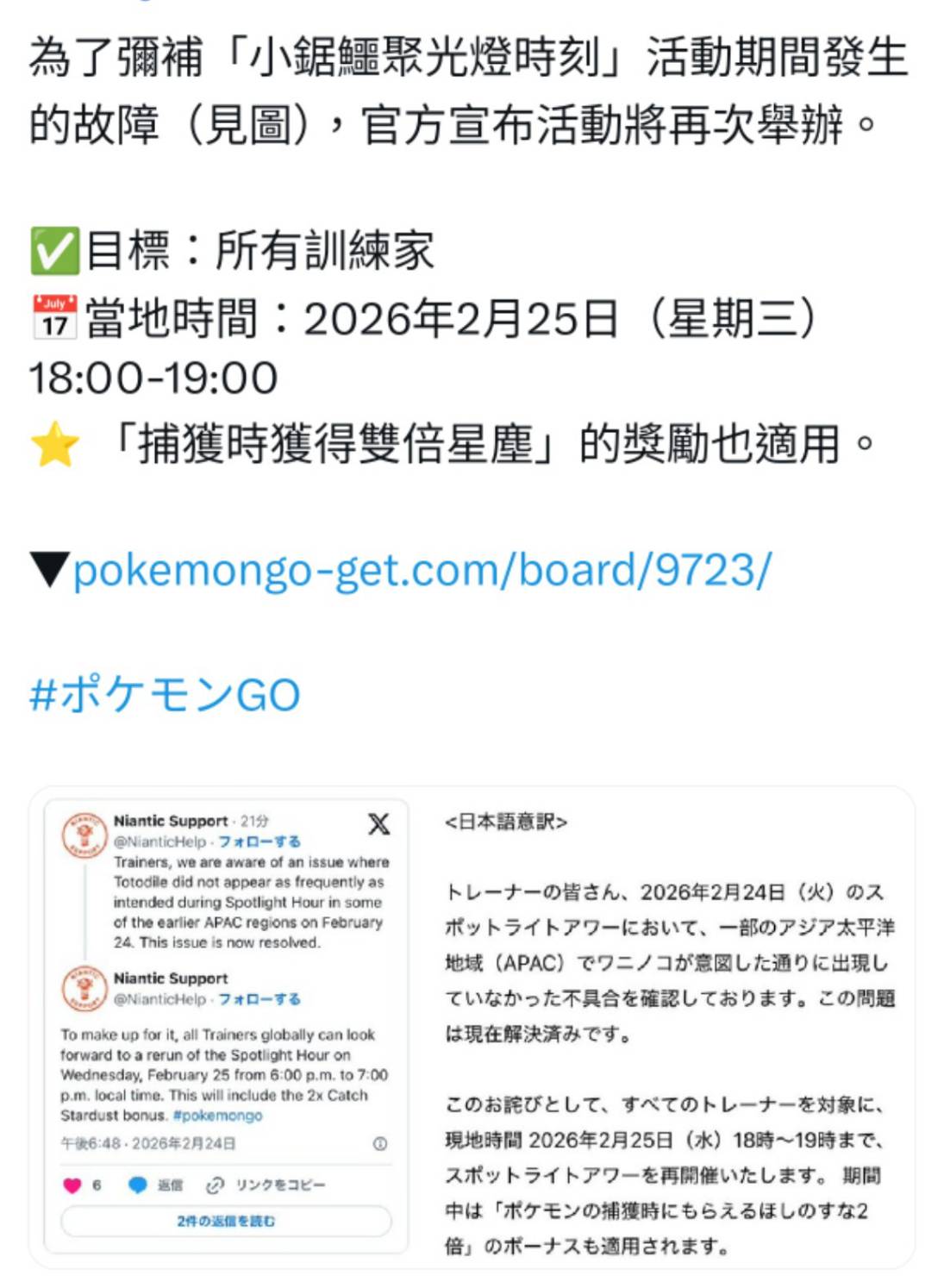 02/25 小鋸鱷聚焦時刻:補償加開公告 Pokemon GO 2026