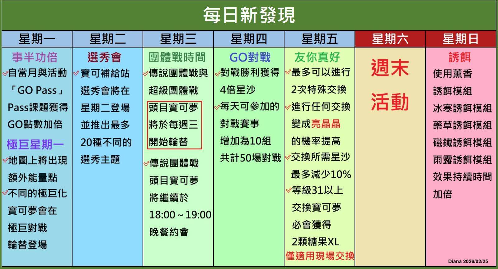 | 日期區間 | 五星團戰 (10:00 輪替) | 超級團戰 (10:00 輪替) | 每週固定活動 / 特別活動 |