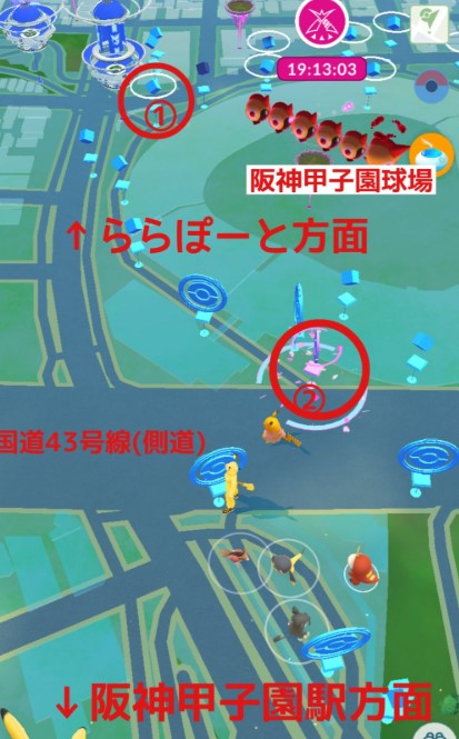 阪神甲子園球場のポケストップ①~②の間で往復する際に回せるギリギリのところです🫡