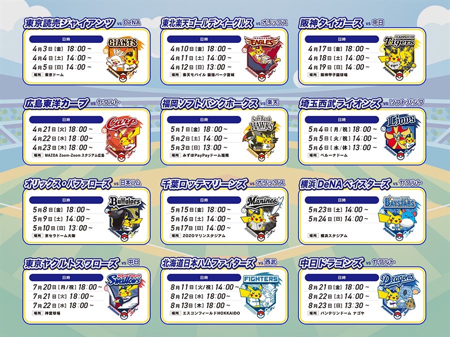 Los 12 equipos de béisbol en Japón muestran en sus logos colaboraciones con Pokémon GO, y cada uno tiene un Pokémon que los representa, ya sea por sus colores o por el nombre.