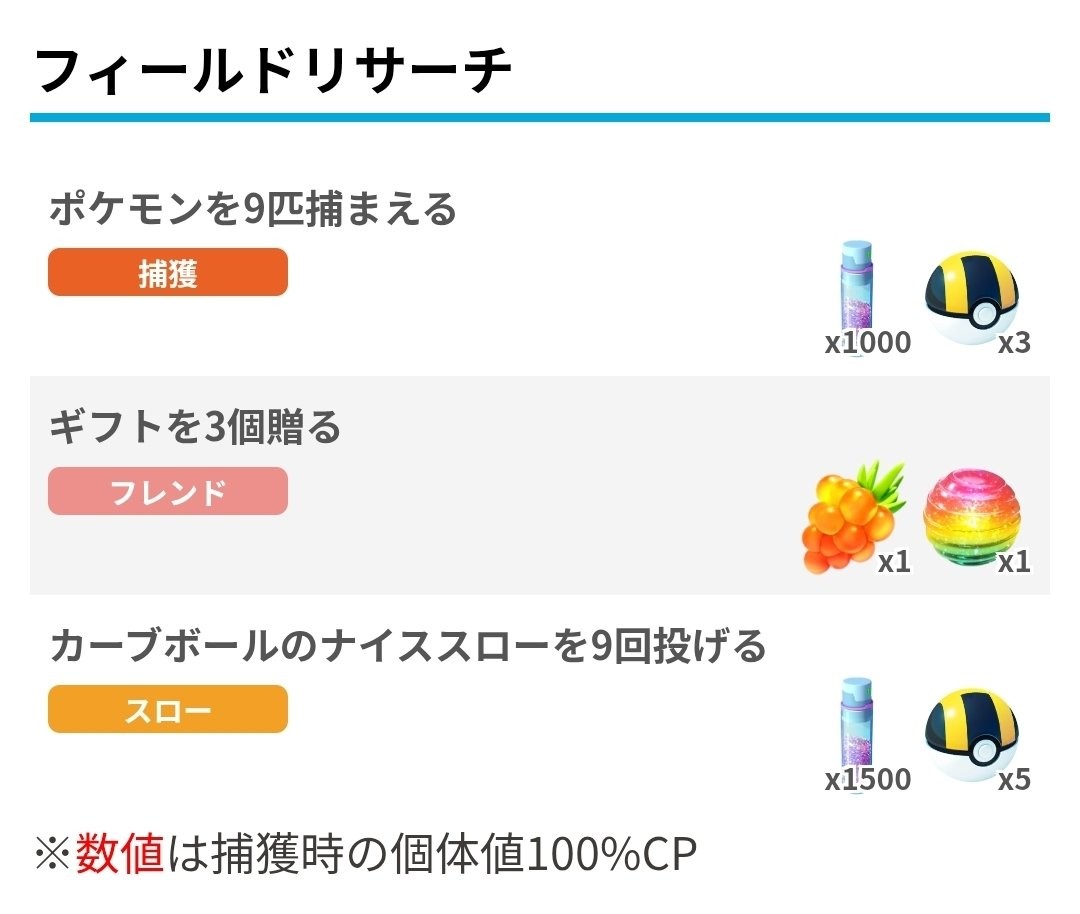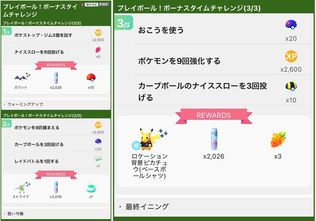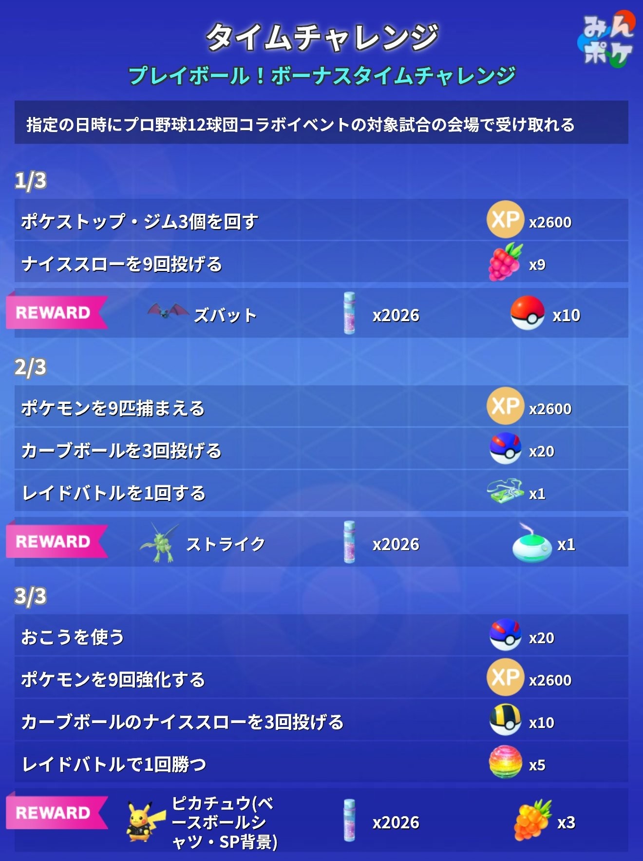 | 指定日:限時調查 | 拜訪球場即可取得。完成可遇見「穿著棒球球衣的皮卡丘」(有機會獲得異色) |