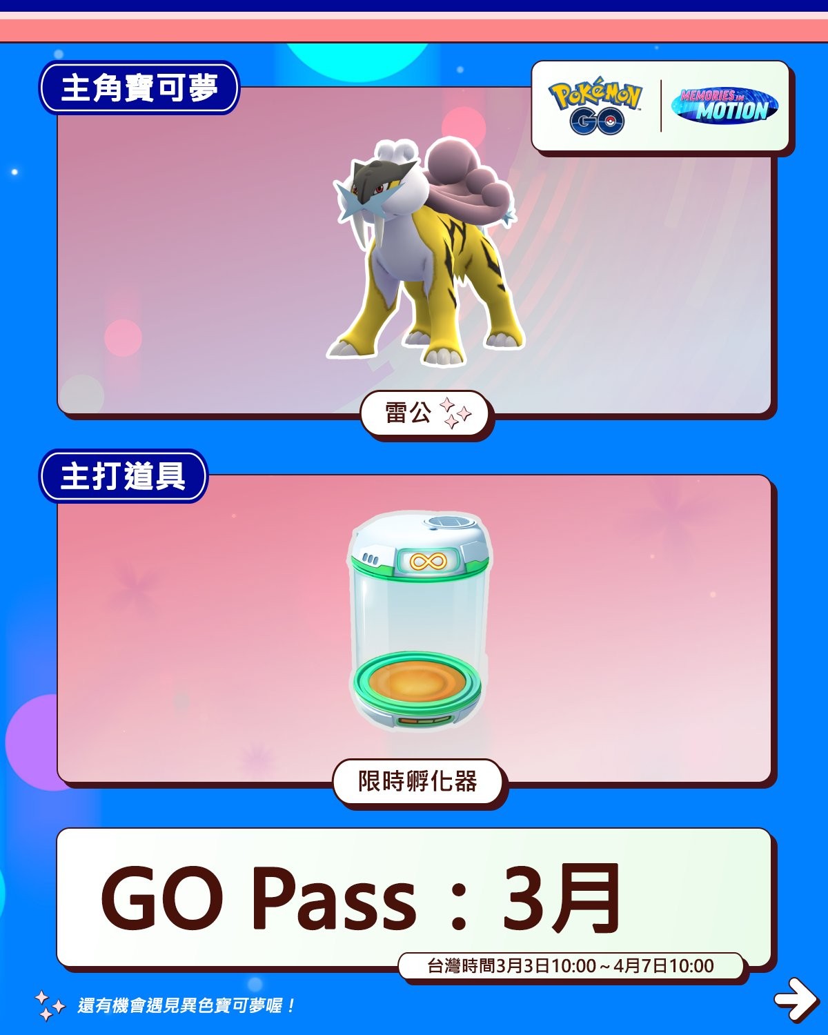 「GO Pass:3月」與「GO Pass豪華版:3月」即將於台灣時間3月3日早上10:00起到4月7日早上10:00期間,在《Pokémon GO》登場!