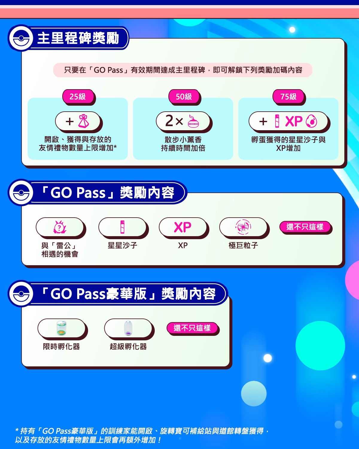 只要7.99美元或等值貨幣,訓練家就能將「GO Pass」升級為「GO Pass豪華版」,持有豪華版可更快速累積進度並獲得更多豐厚獎勵。