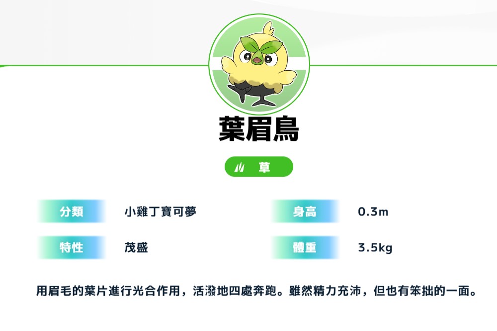 小雞丁寶可夢。用眉毛的葉片進行光合作用,活潑地四處奔跑。