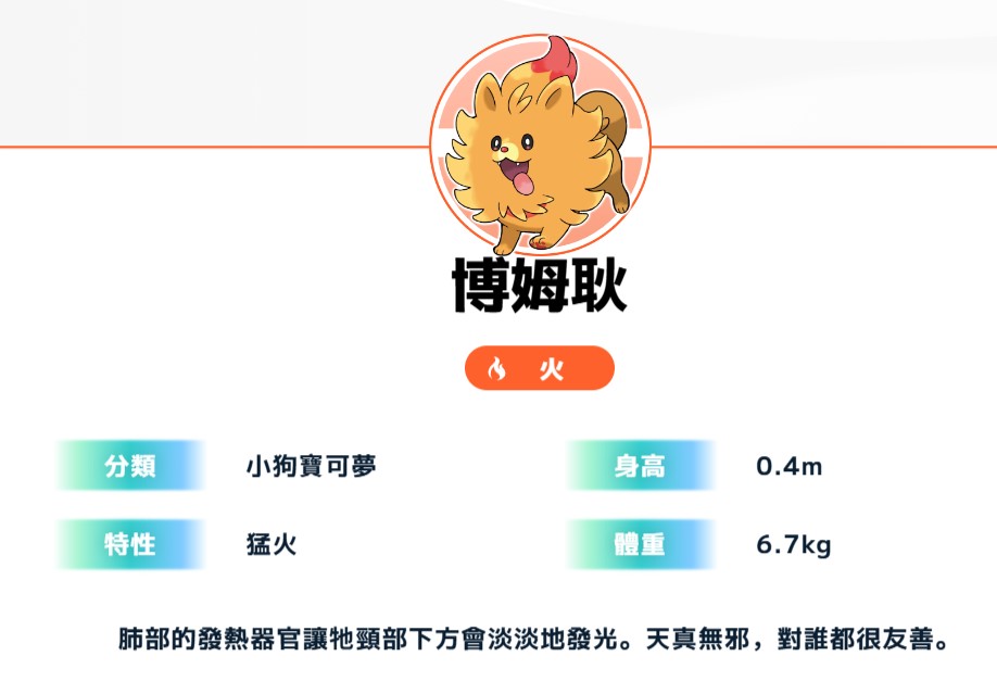 小狗寶可夢。肺部的發熱器官讓牠頸部下方會淡淡地發光。