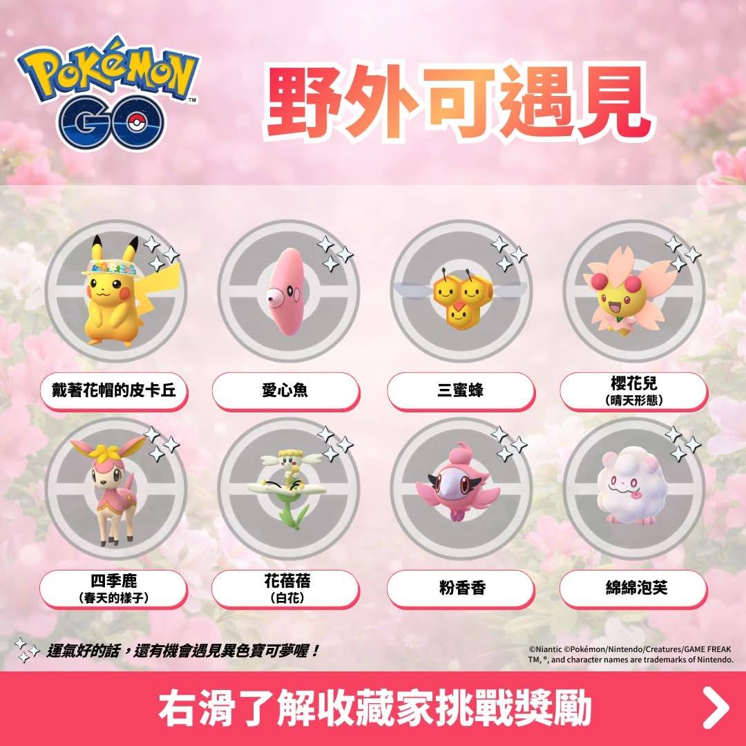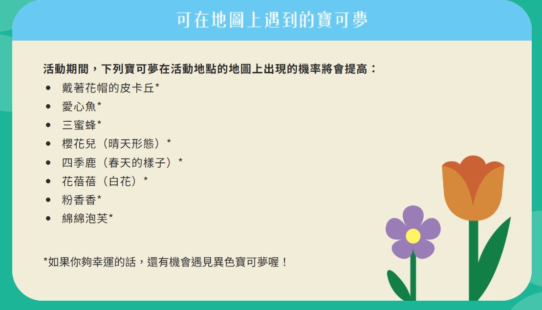| 寶可夢出現 | 地圖遇見機率提高 | 戴著花帽的皮卡丘✨、愛心魚✨、三蜜蜂✨、櫻花兒(晴天形態)✨、四季鹿(春天的樣子)✨、花蓓蓓(白花)✨、粉香香✨、綿綿泡芙✨ |