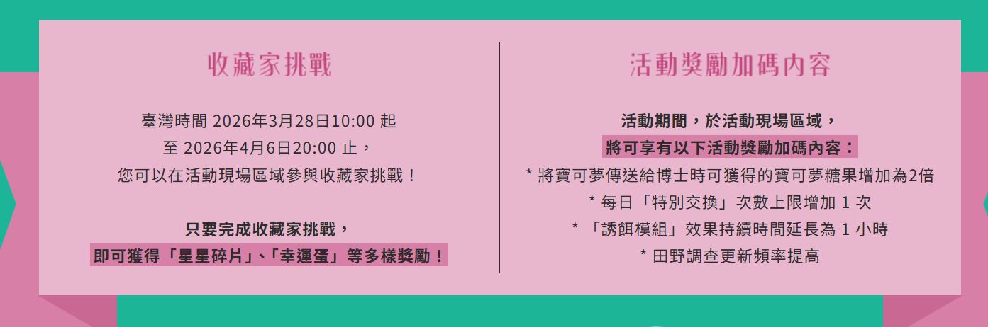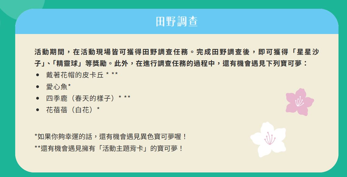 除了有活動主題寶可夢之外,我們也準備了活動期間內可以參與的「限時調查」與「田野調查」。