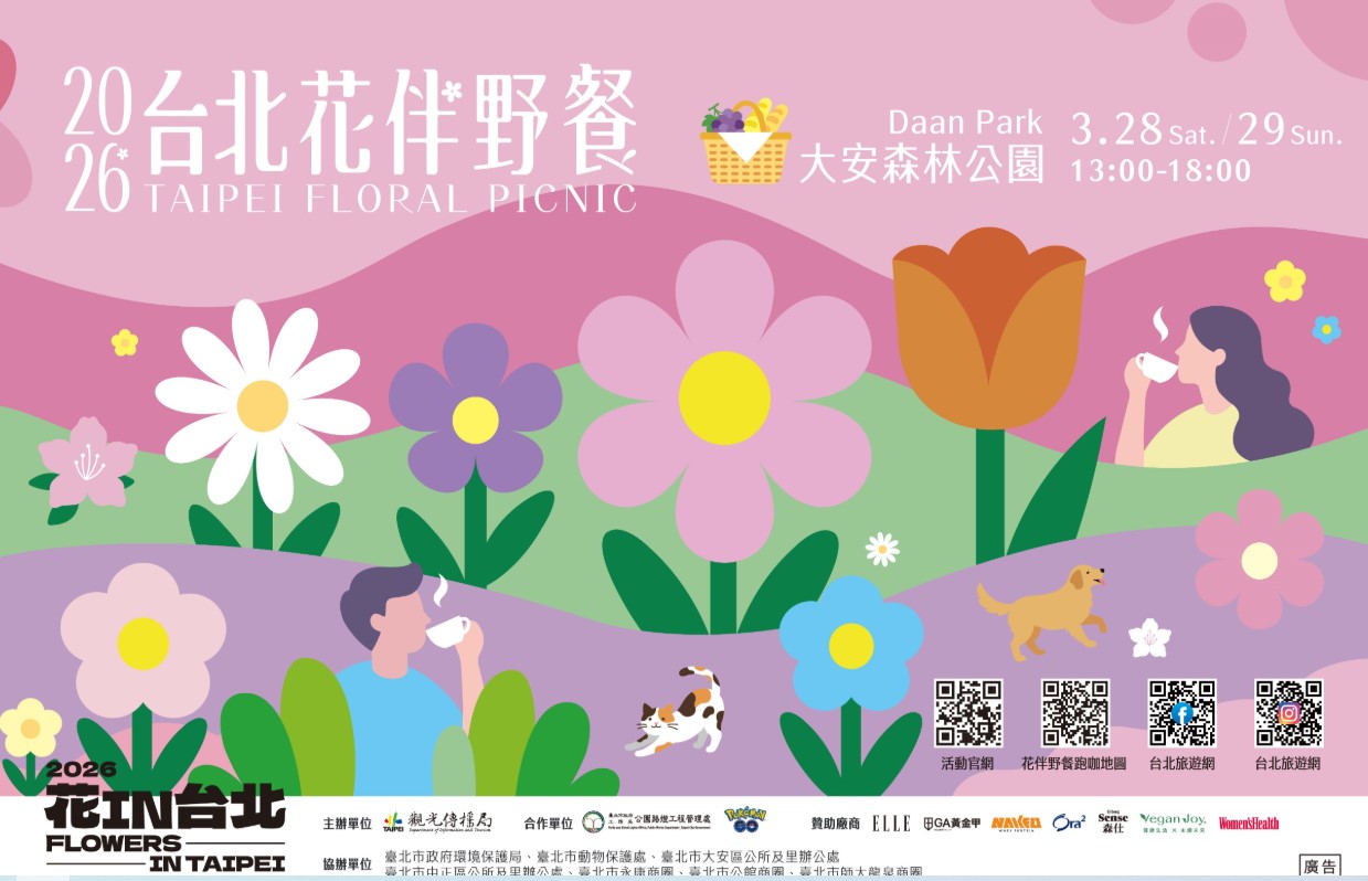 「2026台北花伴野餐」將於3月28、29日在大安森林公園登場!臺北市政府觀光傳播局表示,今年活動升級為週末2天,規劃「咖啡派對」、「美力運動」及「親子毛孩」三大主題野餐區,結合咖啡、音樂、運動、親子與毛孩元素,並串聯草地瑜伽、親子毛孩裝扮秀及國際特色主題市集,打造適合各年齡層參與的春日戶外野餐盛會。今年更首度攜手全球人氣手遊《Pokémon GO》合作,透過遊戲體驗、拍照互動與寶可夢現身,讓花季野餐多了一份驚喜與陪伴,邀請民眾在花季週末走入公園,共度美好春日時光。
