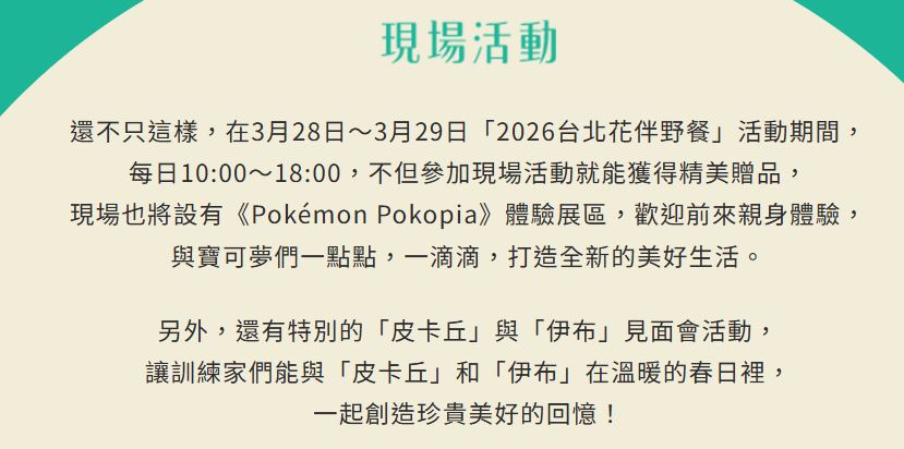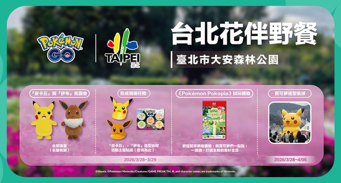 此外,3月28日及29日,將舉辦線下限定活動,現場設置《Pokémon GO》主題攤位和《Pokémon Pokopia》遊戲體驗,玩家完成《Pokémon GO》指定任務後,將有機會兌換限量好禮;同時也可於多款主題裝置前拍照留念,留下專屬回憶。活動期間更安排「皮卡丘」與「伊布」見面會,於活動舞台區與大小朋友近距離互動,以及無論大人或孩子都能樂在其中的《Pokémon Pokopia》遊戲體驗攤位, 必定能為花季野餐增添歡樂氣氛。