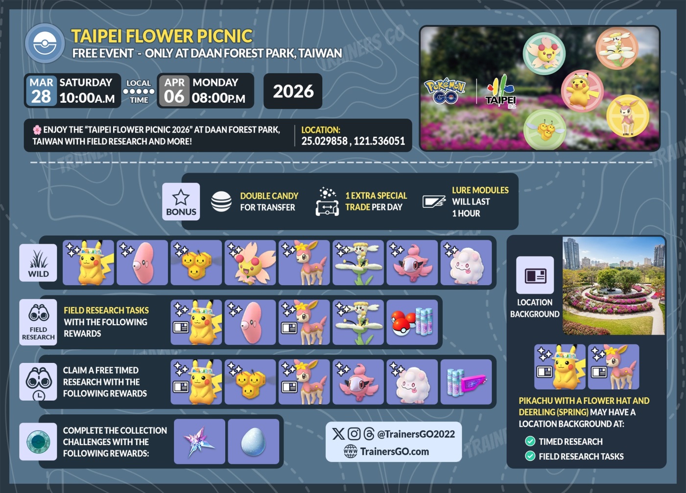 🌸 Información del evento local “Pokémon GO 2026 Picnic Floral de Taipéi”, el cual se realizará exclusivamente en el Parque Forestal Daan, Taipéi.