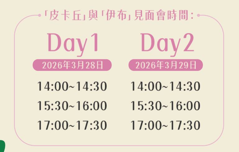 | 14:00-14:30 | 皮卡丘與伊布見面會 | ||