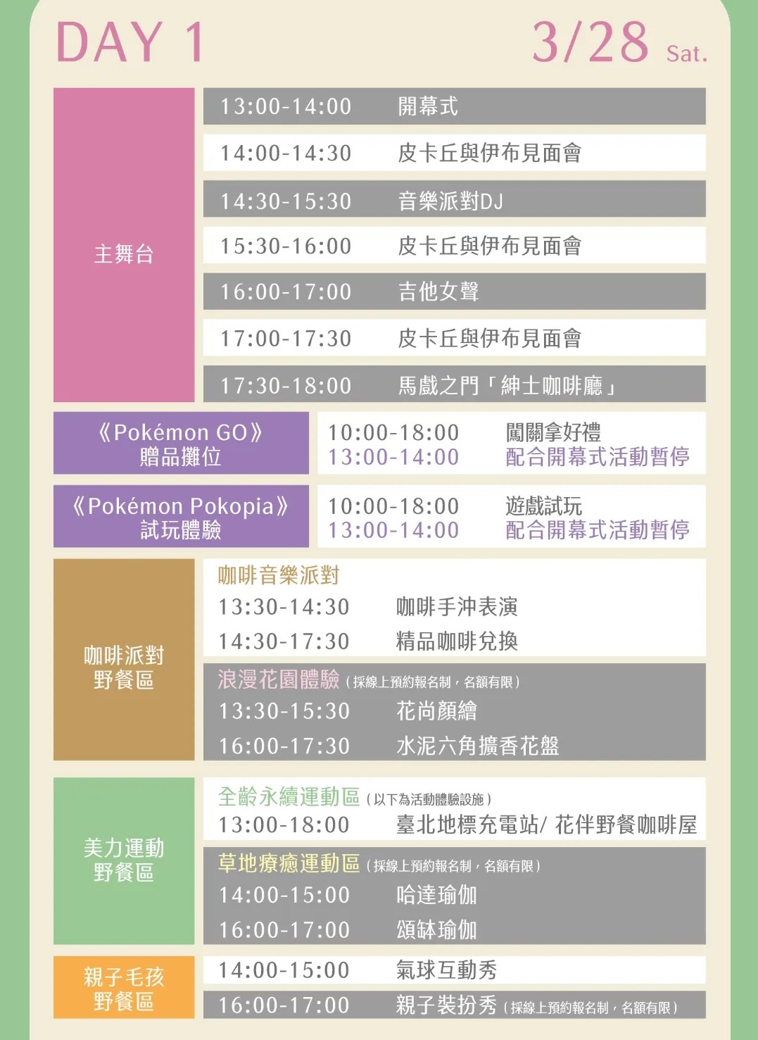 | 美力運動野餐區 | 13:00-18:00 | 臺北地標充電站 / 花伴野餐咖啡屋 | 全齡永續運動區 (以下為活動體驗設施) |