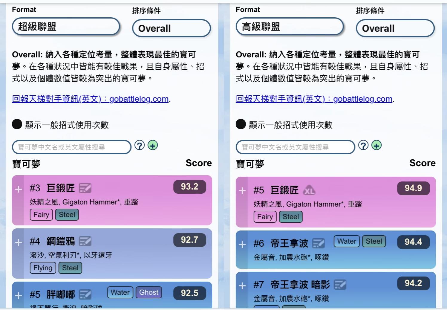寶可夢在不同對戰聯盟中的綜合評分(Score)。
