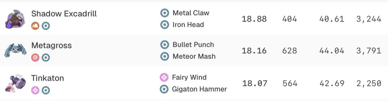 | 巨鍛匠 (Tinkaton) | 妖精 / 鋼 | 妖精之風 (Fairy Wind) | 巨力錘 (Gigaton Hammer) | 18.07 | 564 | 42.69 | 2,250 |