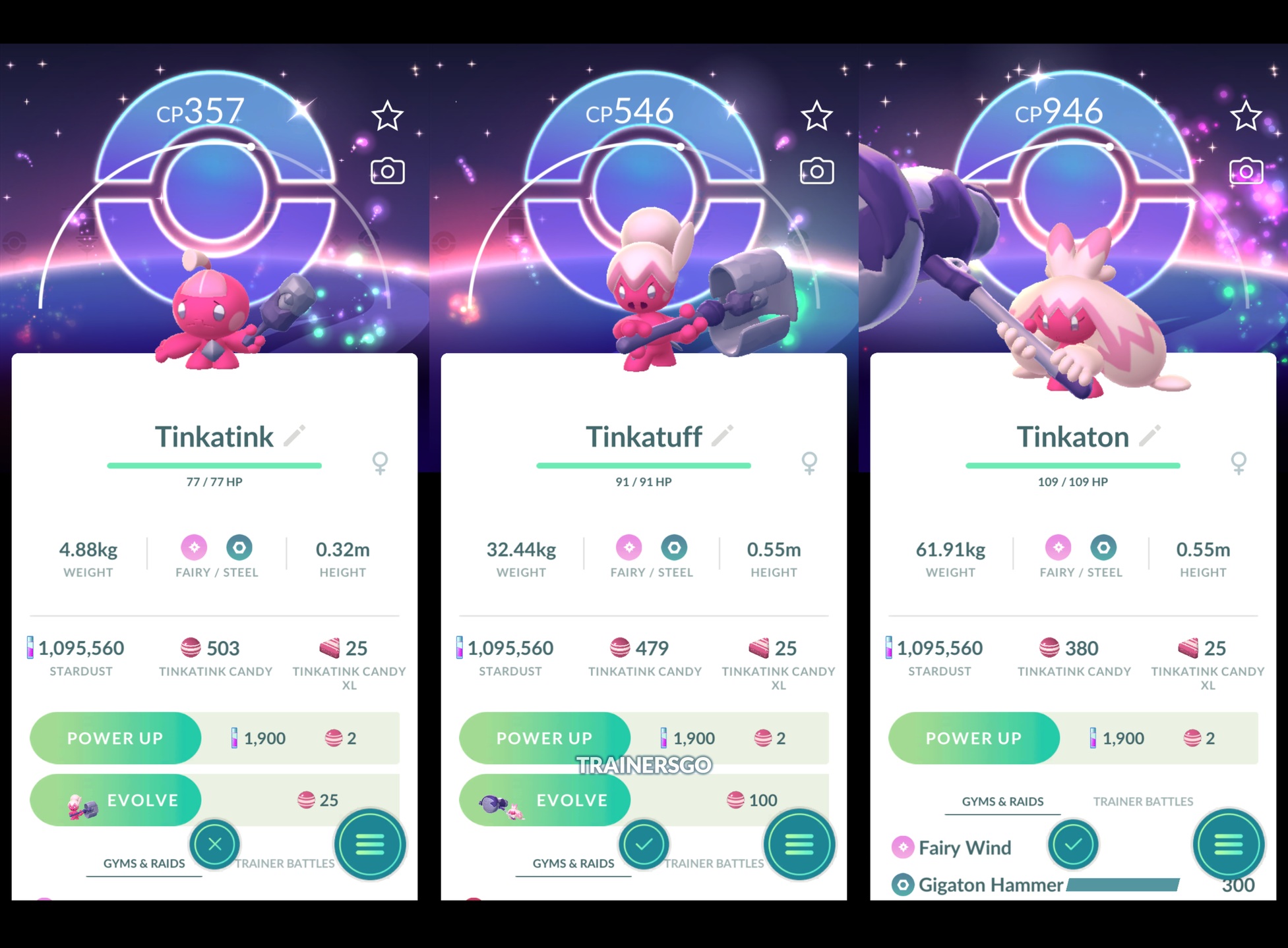 This table shows Tinkatink’s maximum Combat Power on every level, from Level 1 to Level 50. In wild encounters, Tinkatink can be caught from Level 1 – 30, and if weather boosted, from Levels 6 – 35. Tinkatink is boosted by Cloudy and Snow weather.