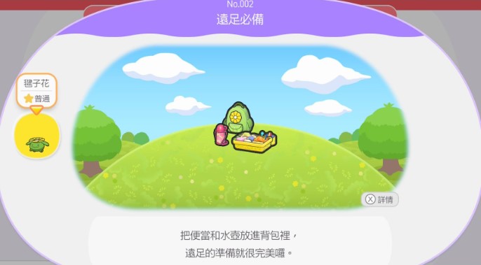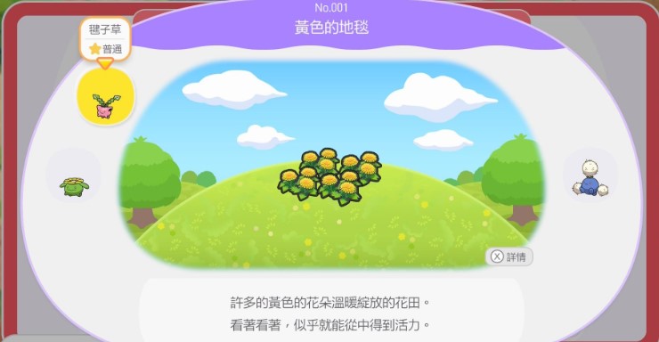 結交進化型態:完成「黃色地毯」棲息地後,就能吸引「毽子花」與極為稀有的「毽子棉」前來。由於毽子棉出現的機率較低,佈置完成後請耐心去探索其他區域,過一段時間再回來查看。