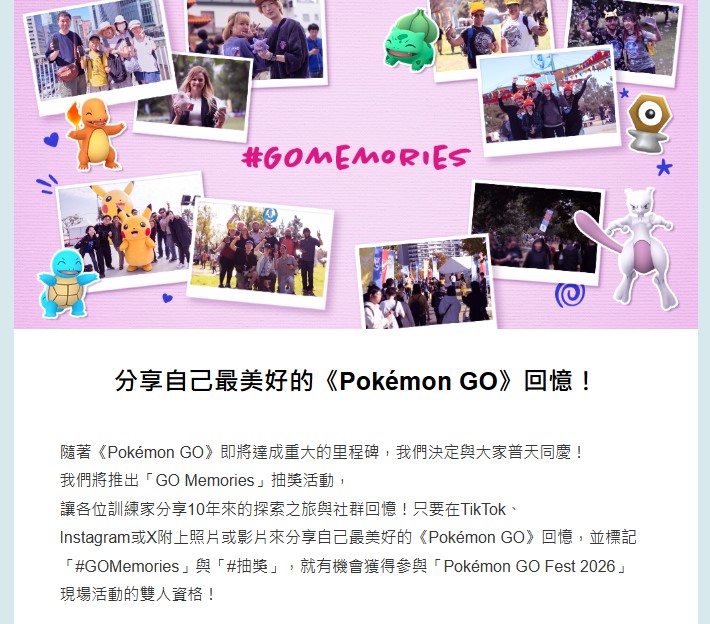 官方為了慶祝《Pokémon GO》10週年,只要訓練家追蹤官方全球TikTok、Instagram或X帳號(@PokemonGO 或 @PokemonGOApp),並使用指定hashtag( #GOMemories 與 #Sweepstakes )分享自己在《Pokémon GO》的美好回憶,就有機會獲得參與「Pokémon GO Fest 2026」現場活動的雙人資格!