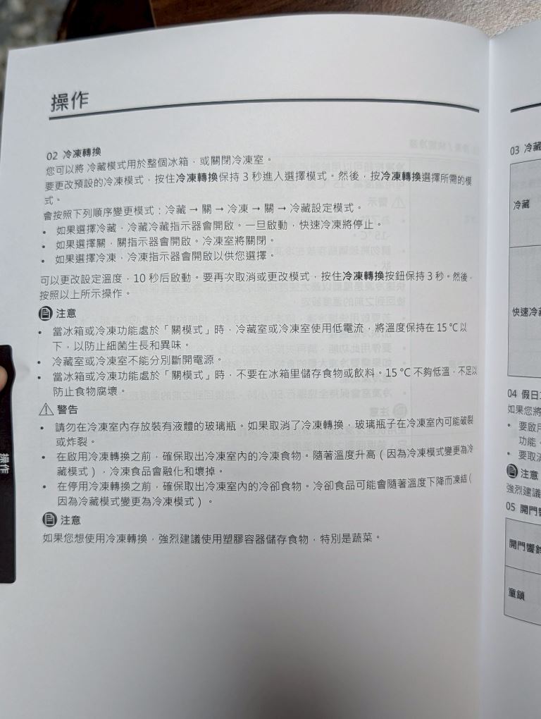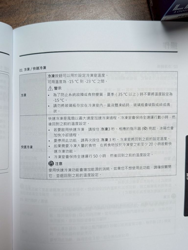 說明書特別警告:夏天不要將冷藏設定在 5-7°C,且夏季高溫(35°C 以上)時冷凍不要設定為 -15°C,否則可能導致冷卻效能出問題或食物變質。