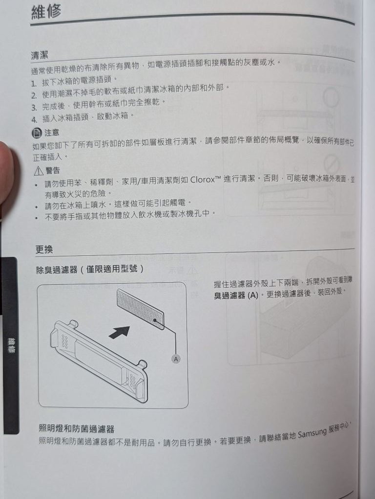 照明燈和防菌過濾器都不是耐用品。請勿自行更換。若要更換,請聯絡當地 Samsung 服務中心。