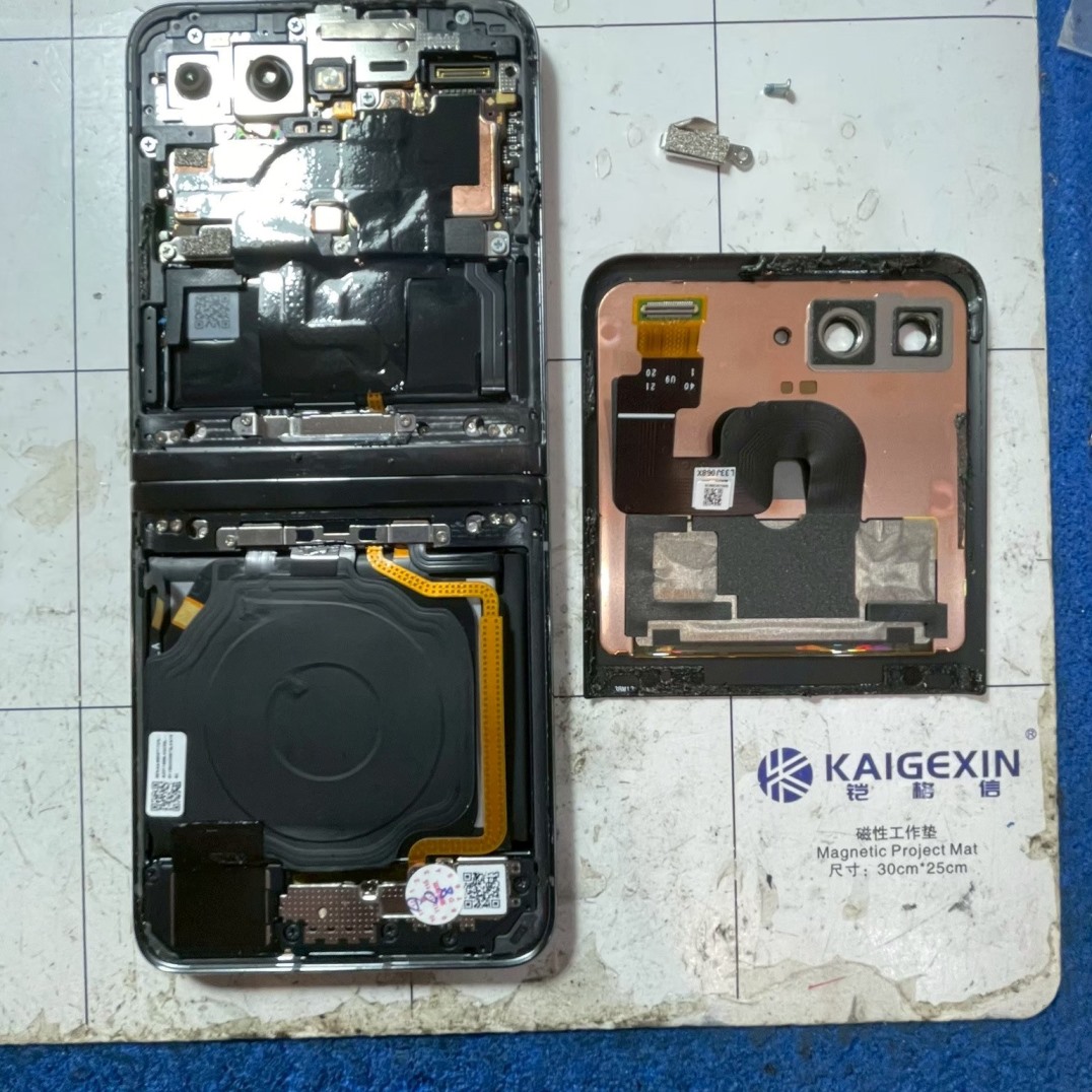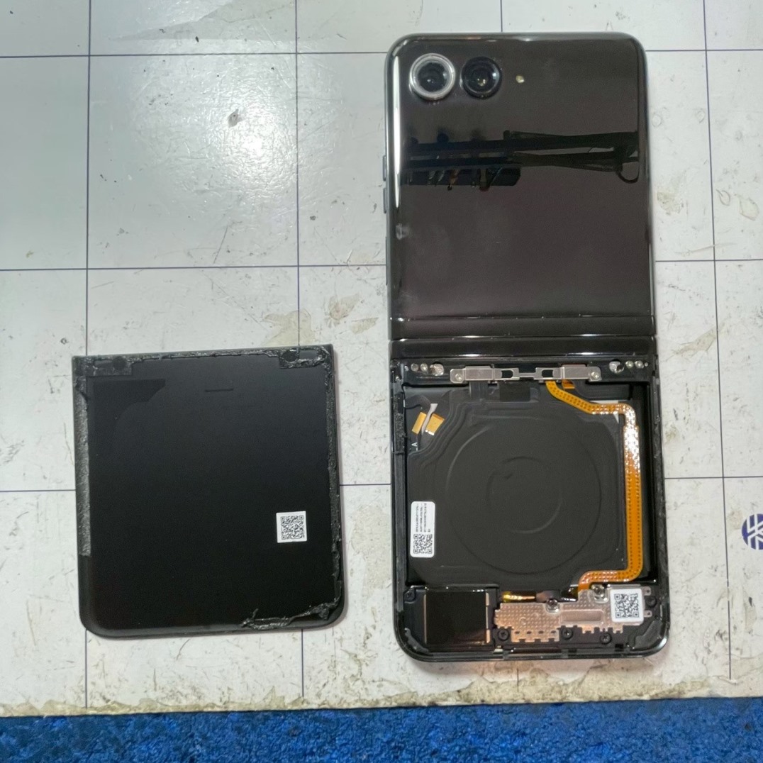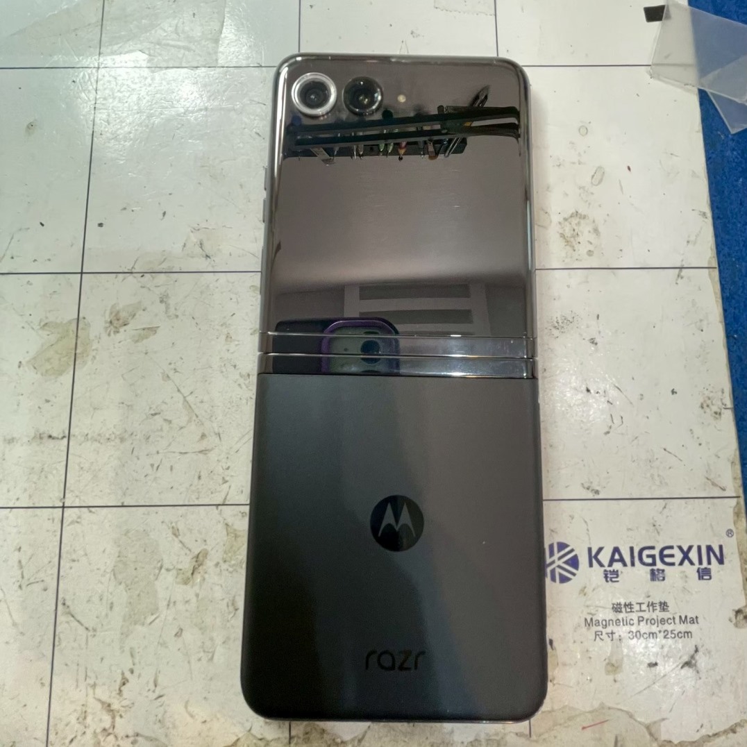 Motorola razr 40 Ultra 換電池標準流程簡述。特別注意此型號為摺疊機,採用上下雙電池設計,拆裝難度較直立手機高: