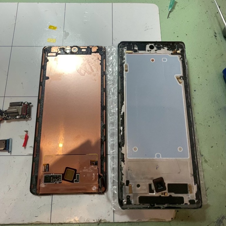 拆卸舊螢幕:使用吸盤與拆機片,從螢幕邊緣小心劃開。由於曲面螢幕兩側延伸至邊框且極薄,需特別注意不要刮傷金屬中框,隨後將舊螢幕與排線一併抽出。