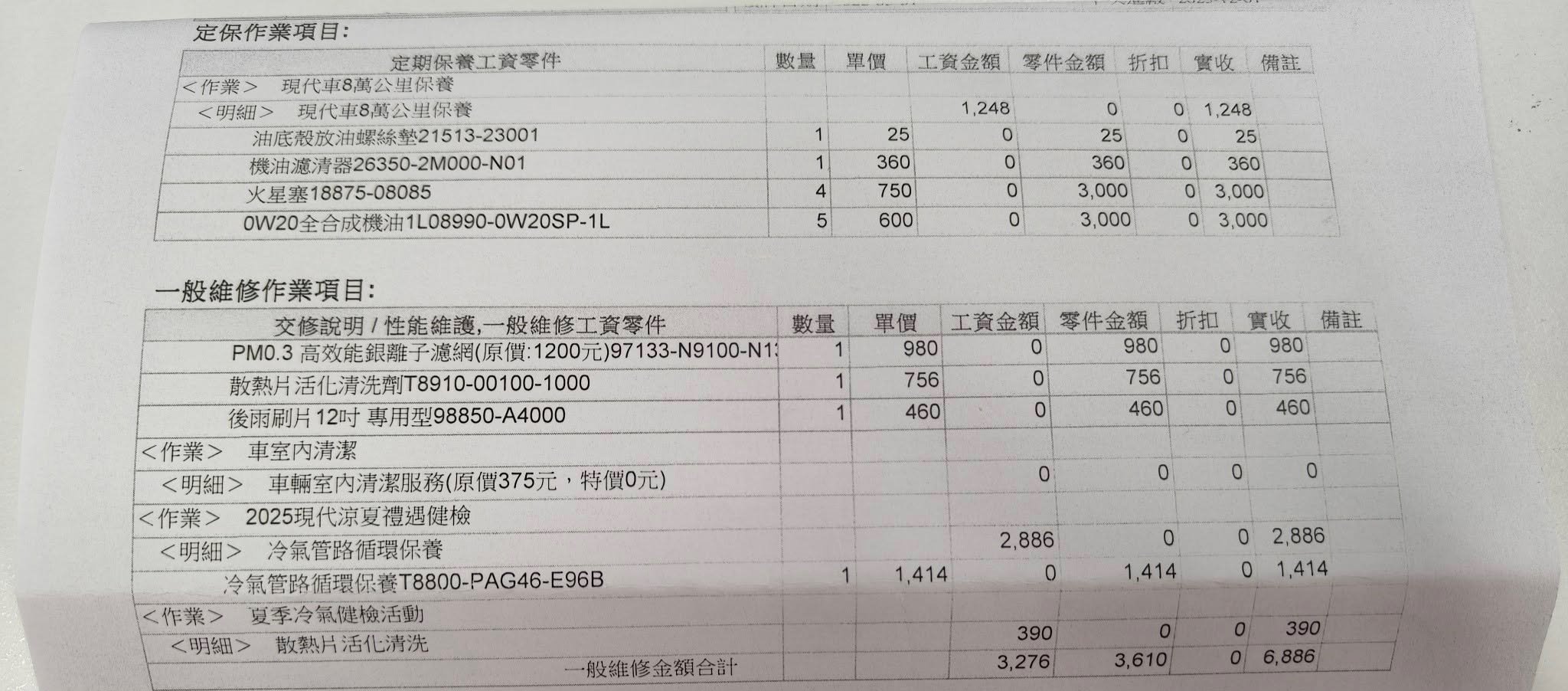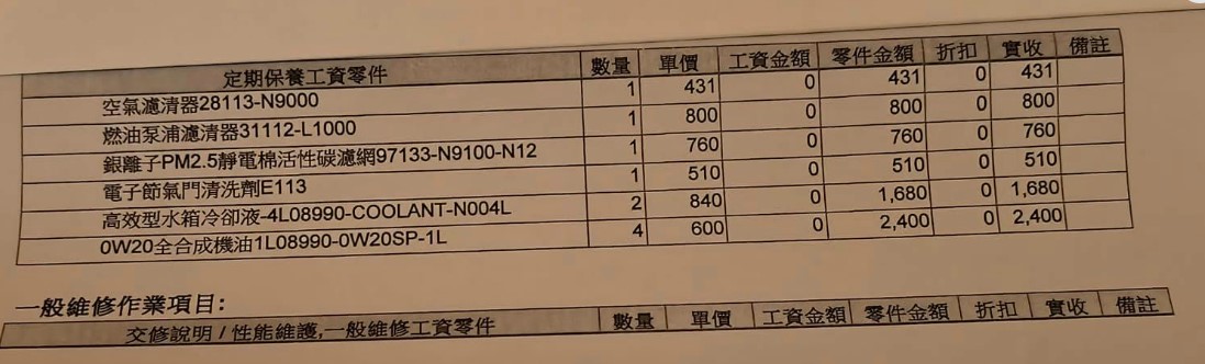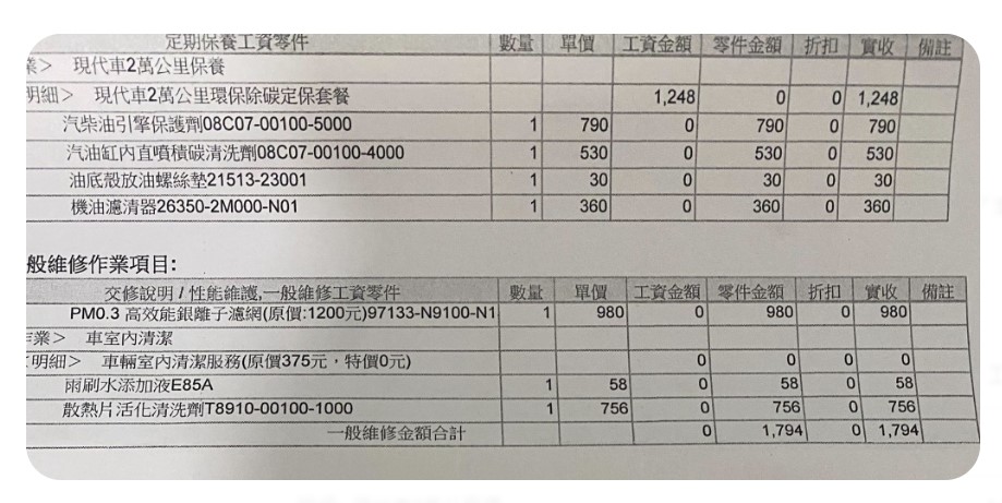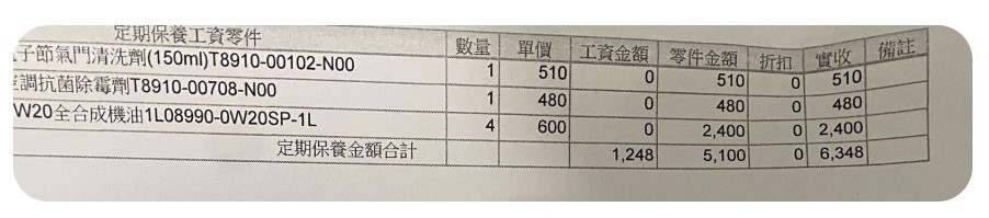 | <明細> 現代車8萬公里保養 | 1,248 | 0 | 0 | 1,248 | |||