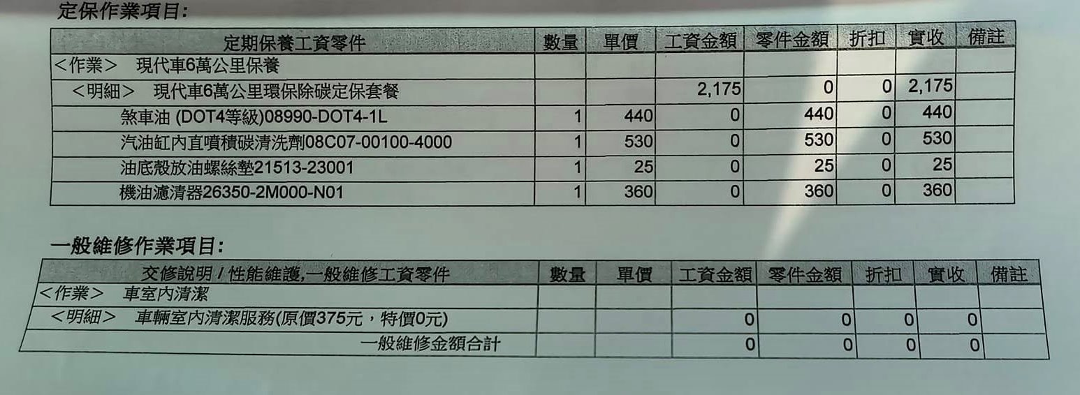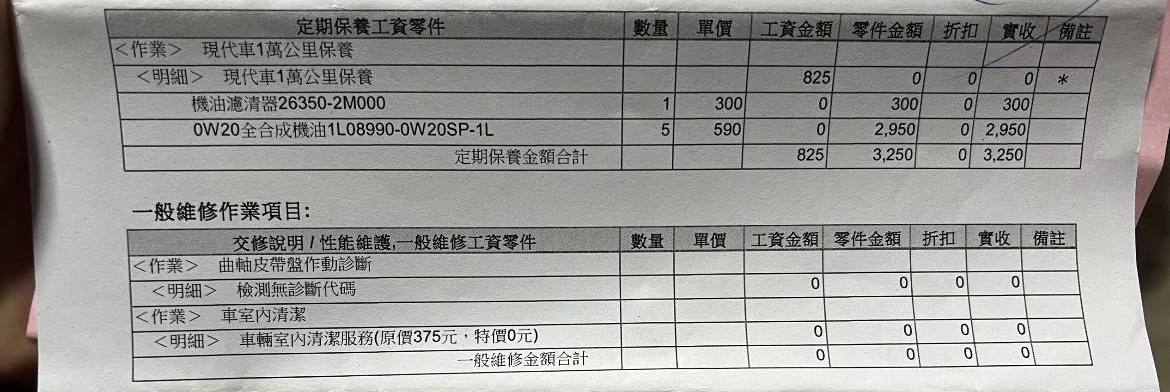 | <明細> 現代車1萬公里保養 | 825 | 0 | 0 | 0 | * | ||
