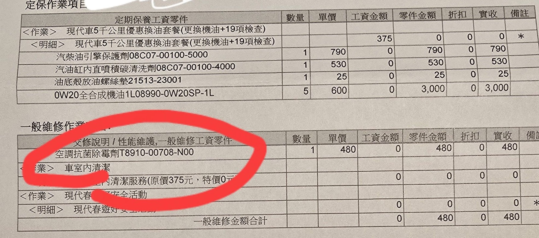 | <明細> 現代車5千公里優惠換油套餐(更換機油+19項檢查) | 375 | 0 | 0 | 0 | * | ||