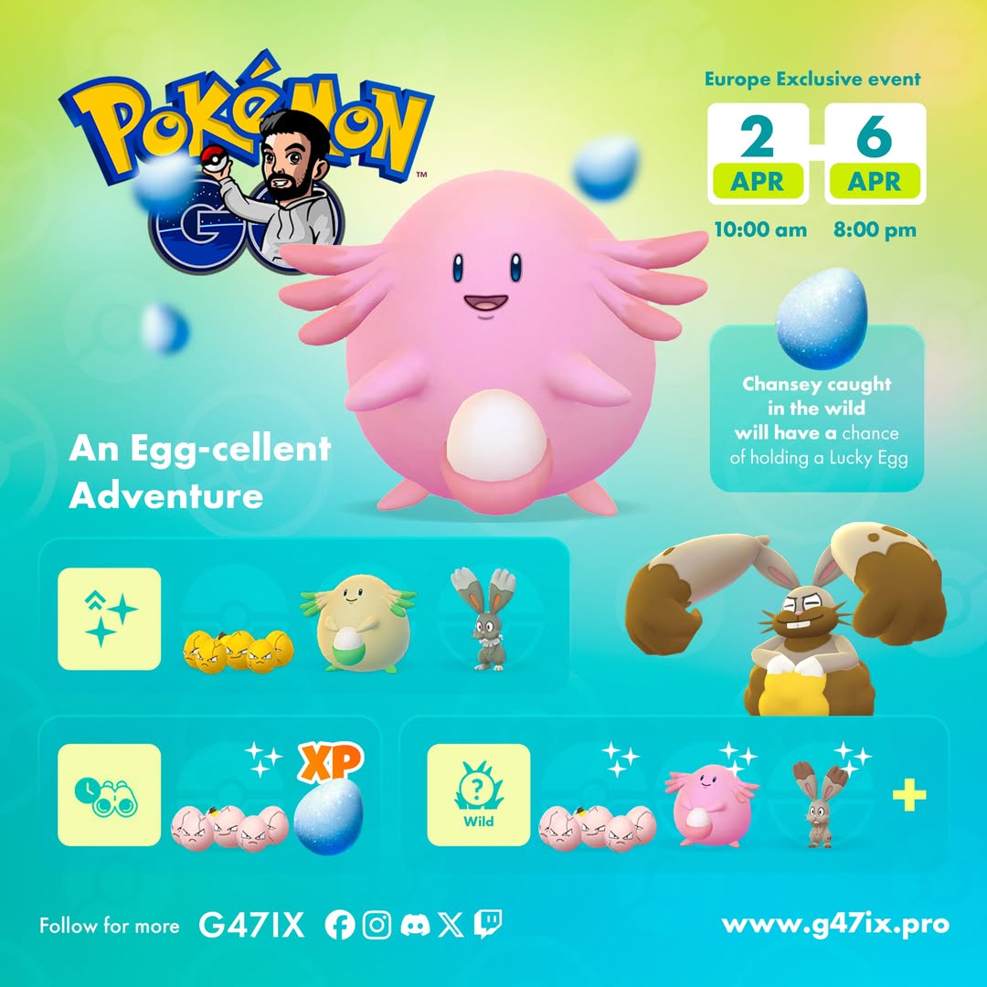 Trainers may encounter event-themed Pokémon in the wild, including Exeggcute*, Chansey*, Bunnelby*, and more!