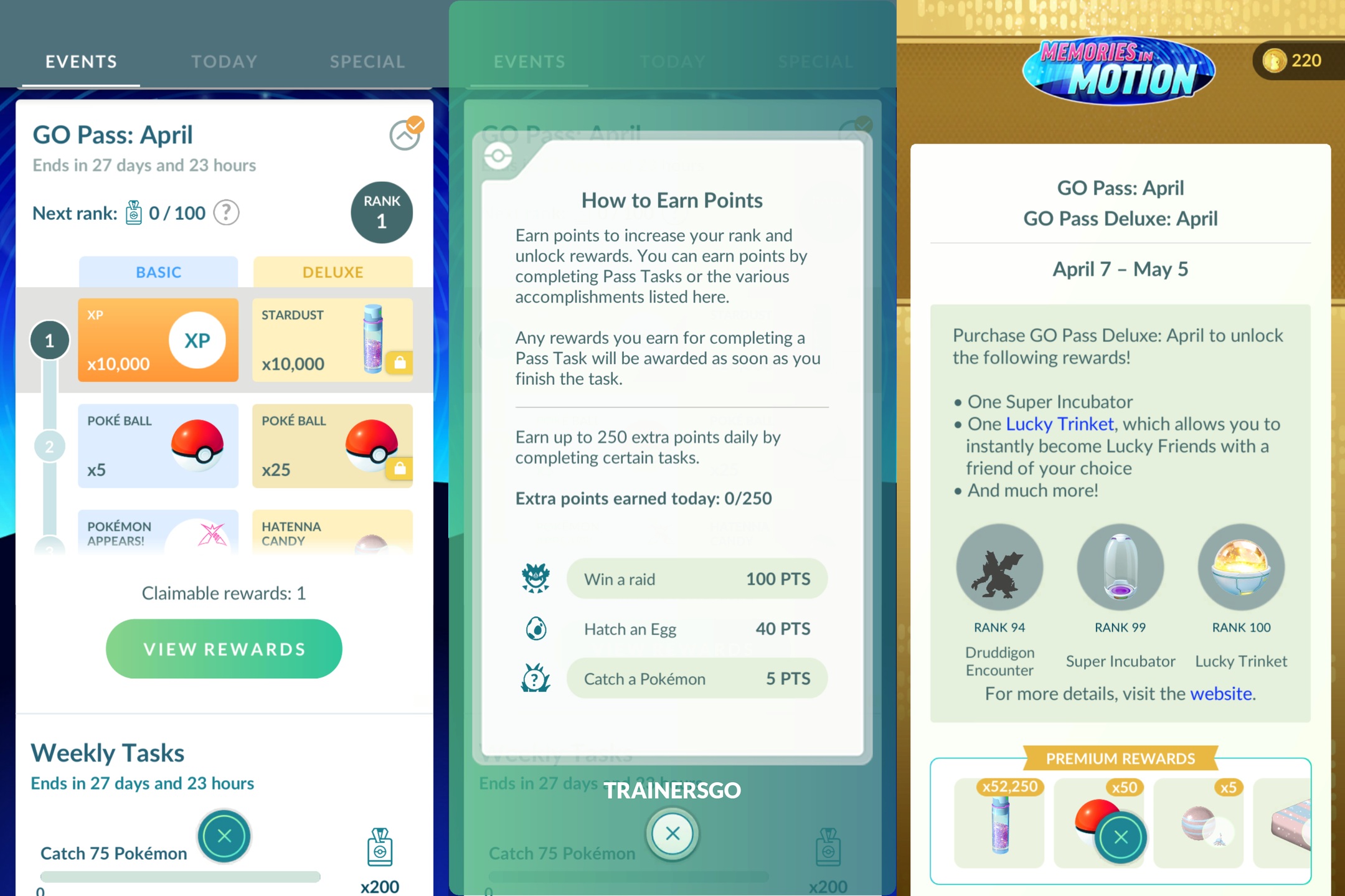訓練家會在台灣時間4月7日10:00起獲得系統發放的免費「GO Pass:4月」,並且能夠在台灣時間5月5日10:00前累積「GO點數」、提升級別來獲取額外的獎勵內容。