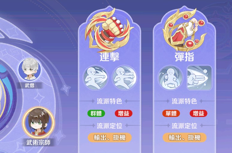流派特色:群體、增益。透過連續技的施放維持高輸出與自身減傷,適合穩定掛機與持續近戰輸出。