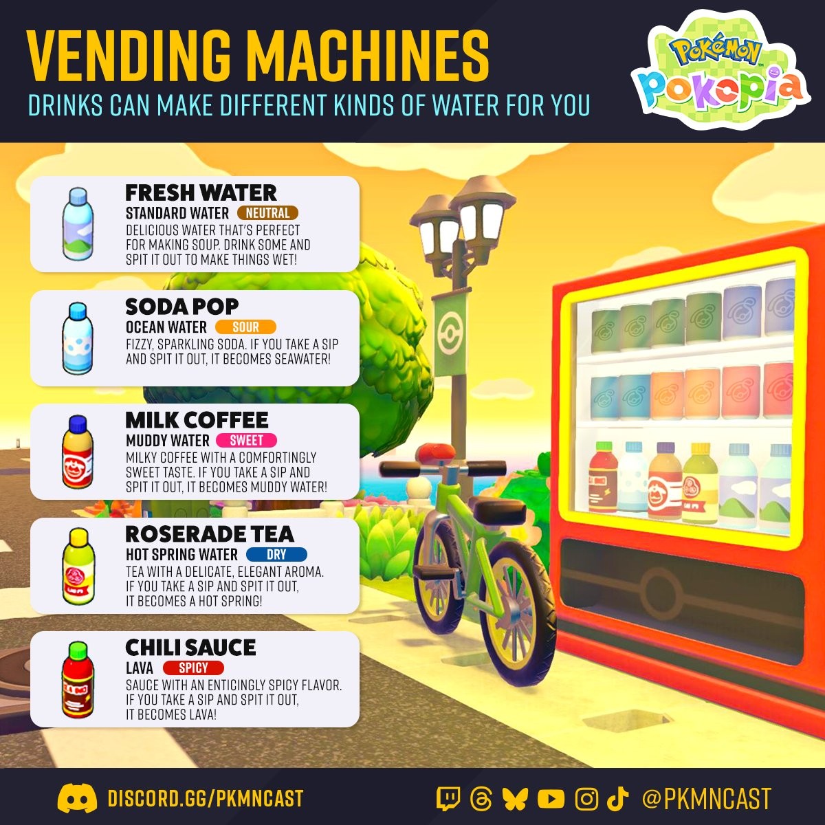 每天可以從你擁有的每一台自動販賣機中隨機獲得一瓶飲料。這些飲料有兩種主要用途,第一是交給 Mosslax,第二是玩家自己喝下一口後吐出,藉此在島嶼上創造全新的水源或特殊地形。