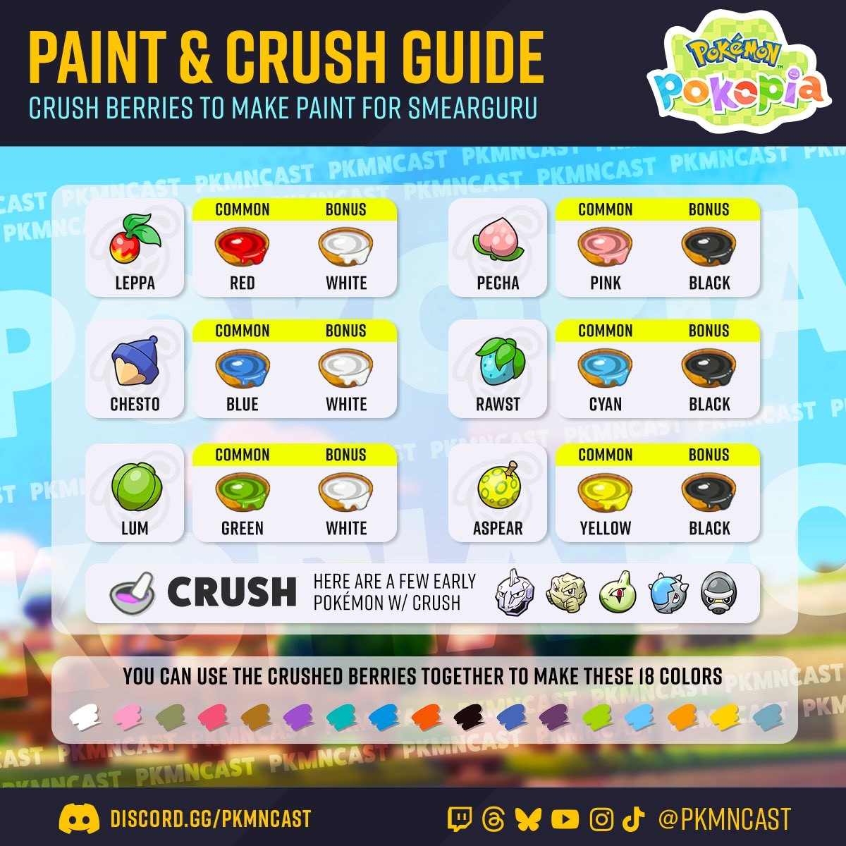 不同的樹果在搗碎後,會產出對應的常見基礎顏色,並有機會獲得額外的加碼顏色: