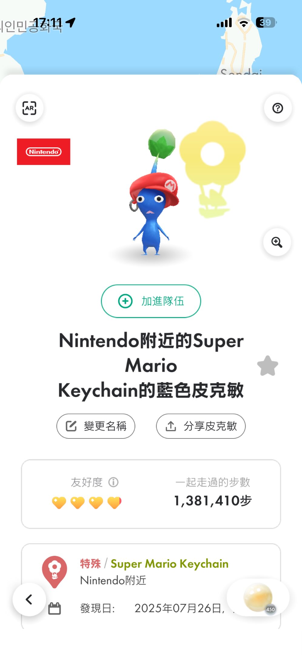 🍄散步 2,000 步 → 拿紫色鑰匙圈皮克敏