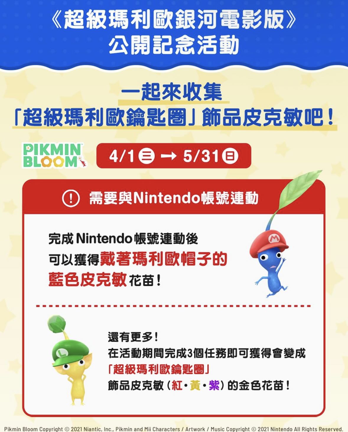 活動期間只要依序完成以下三個任務,就能取得超級瑪利歐鑰匙圈皮克敏的金色花苗: