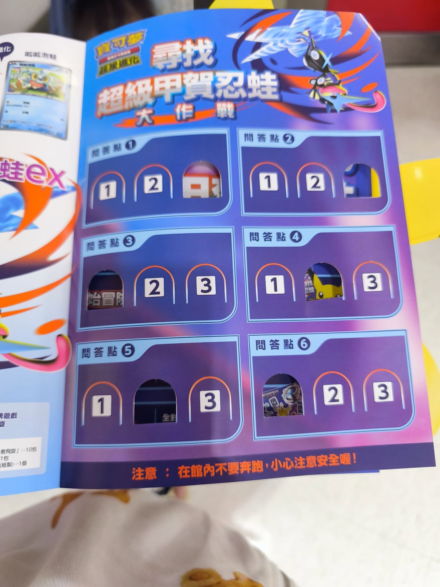 在以下地點領取手冊及皮卡丘紙帽後,即可開始尋找隱藏在館內各處的超級甲賀忍蛙以及解謎點 🕵️♂️🔎,在手冊上回答各個解謎點的答案後,於終點提示給工作人員,全部答對者即可獲得貼紙及寶可夢硬幣一枚!🎁✨