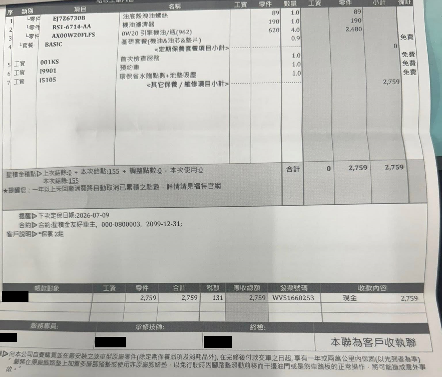 | 5 | 工資 | 001KS | 首次檢查服務 | 1.0 | 0 | 免費 | ||