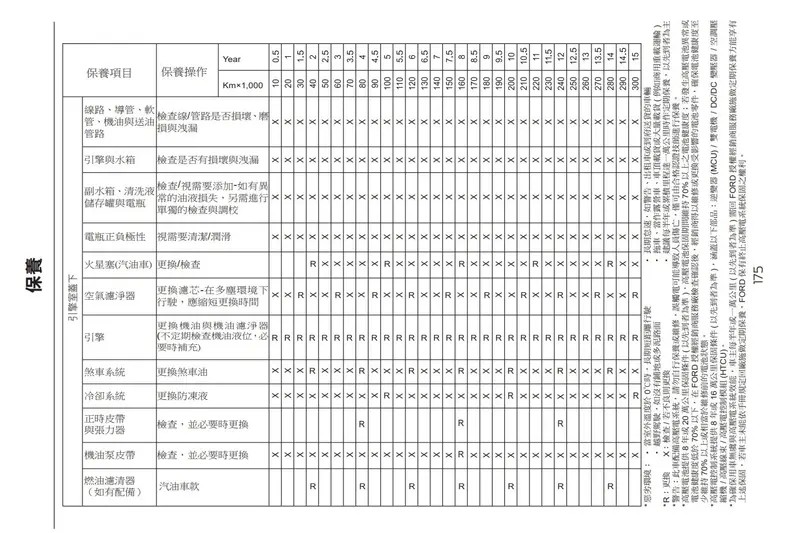 | 引擎 | 更換機油與機油濾淨器 (需定期檢查機油位) | 每一萬公里皆需更換 (R) |