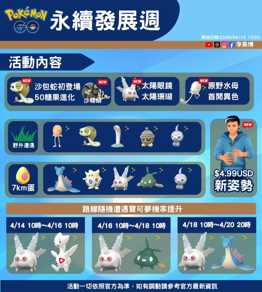 04/14 新增田野任務獎勵更新 永續發展週 Pokemon GO 2026