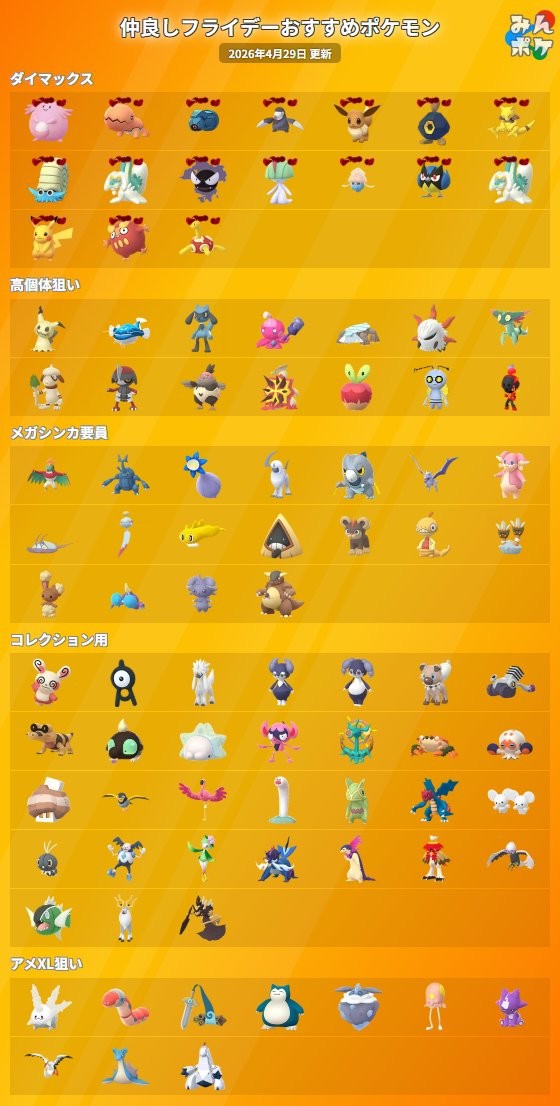 2026 年 4 月 29 日更新的「友好星期五」(仲良しフライデー)推薦寶可夢清單,主要分為以下五大類別: