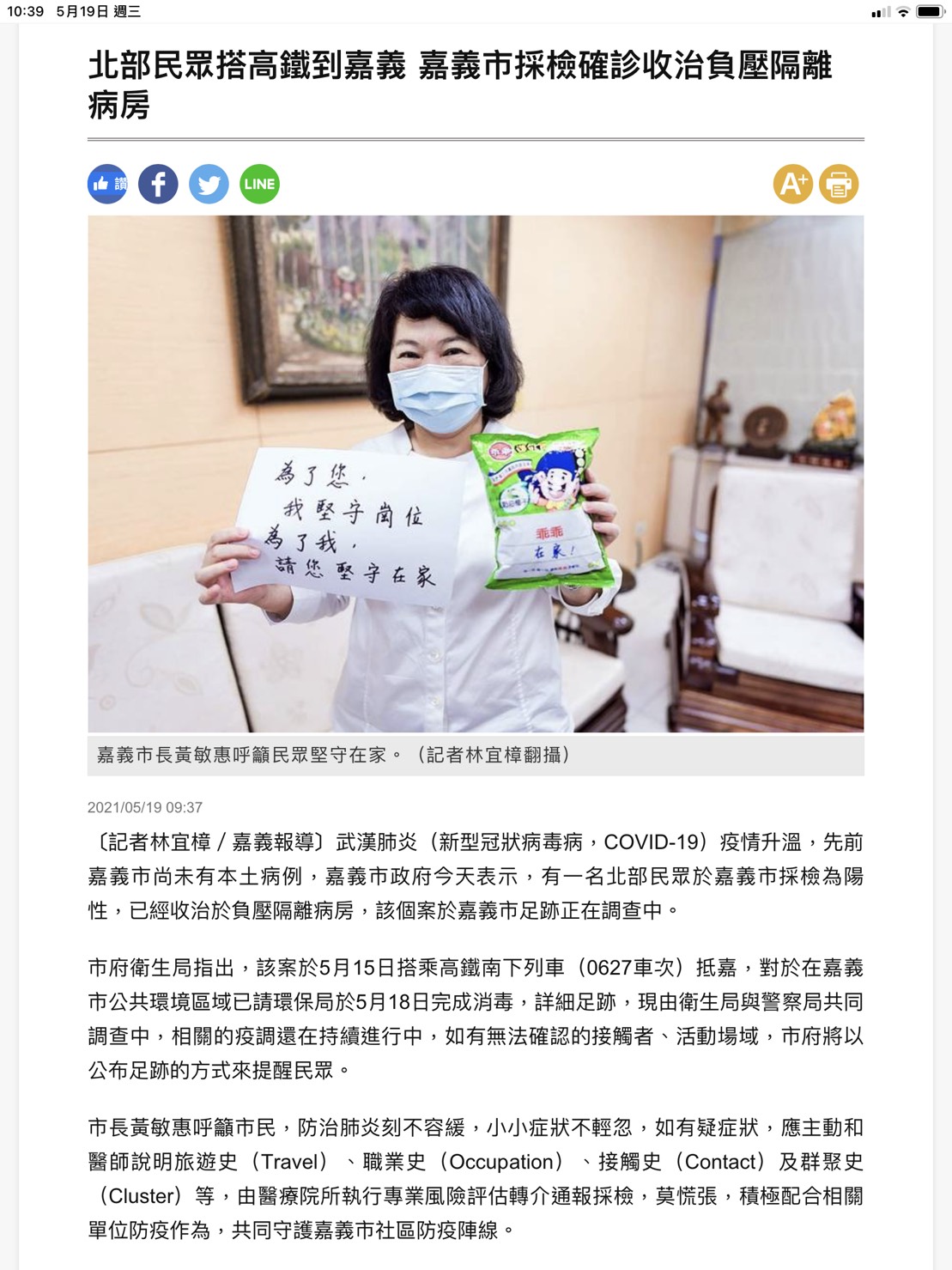 北部民眾於嘉義市採檢為陽性,已經收治於負壓隔離房,個案於本市之足跡正在調查中。案係於5/15搭乘高鐵南下列車(0627車次)抵嘉,對於在本市公共環境區域已請環保局於5/18完成消毒,詳細足跡,現由衛生局與警察局共同調查中。
