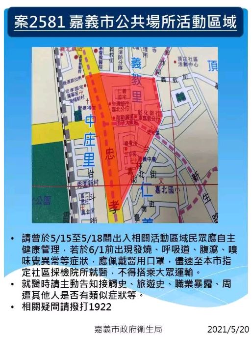 🎯#疫調足跡:在5/15至5/18 期間曾於本市義教街、忠孝路、台林街、新生路區段活動